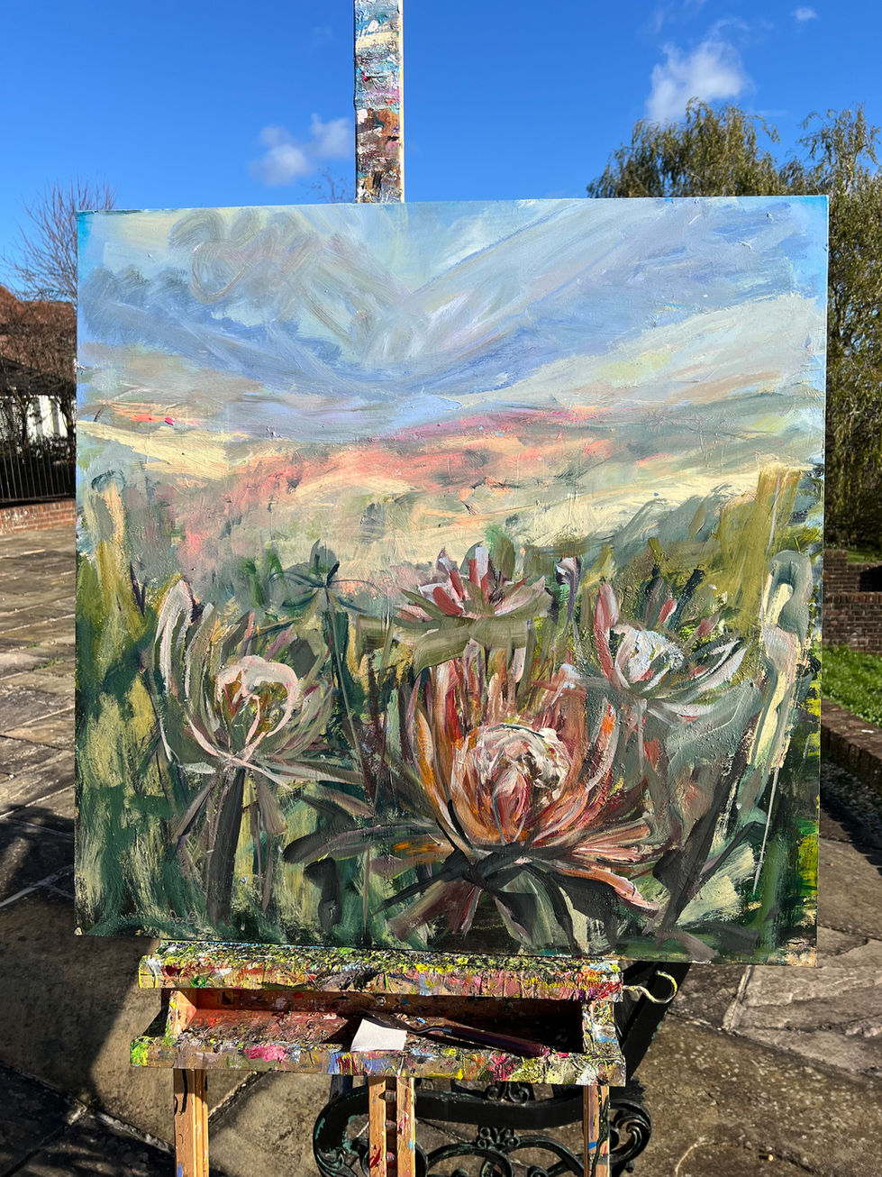 ‘Blooming Horizons’ channels the soft energy of the South African landscape, where Protea flowers lift their heads toward pastel skies. Gentle brushwork and layered colour create a feeling of movement, as though a warm breeze has just passed through the scene. The palette brings together dusk pinks, muted blues, and earthy greens to form a peaceful, uplifting composition. This piece is part of the Raw & Rural Collection and measures 30" × 30".