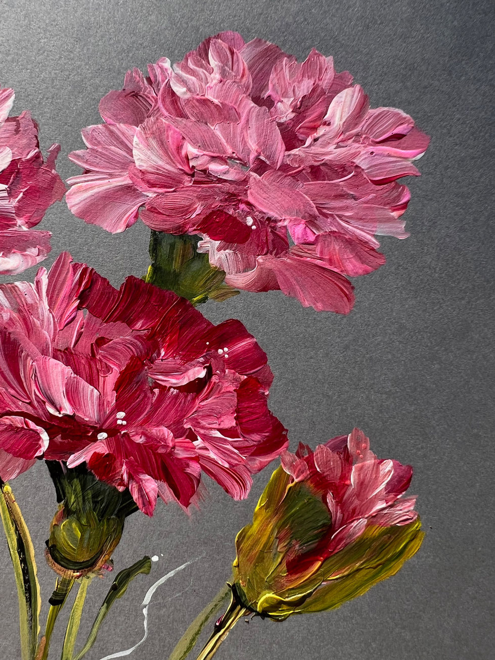From the Garden in Gold collection, Carnations in Soft Meadow Air focuses on pink carnations drifting gently in open space, as if caught in a warm meadow breeze. The soft edges and layered petals give the piece a tender, contemplative feel.