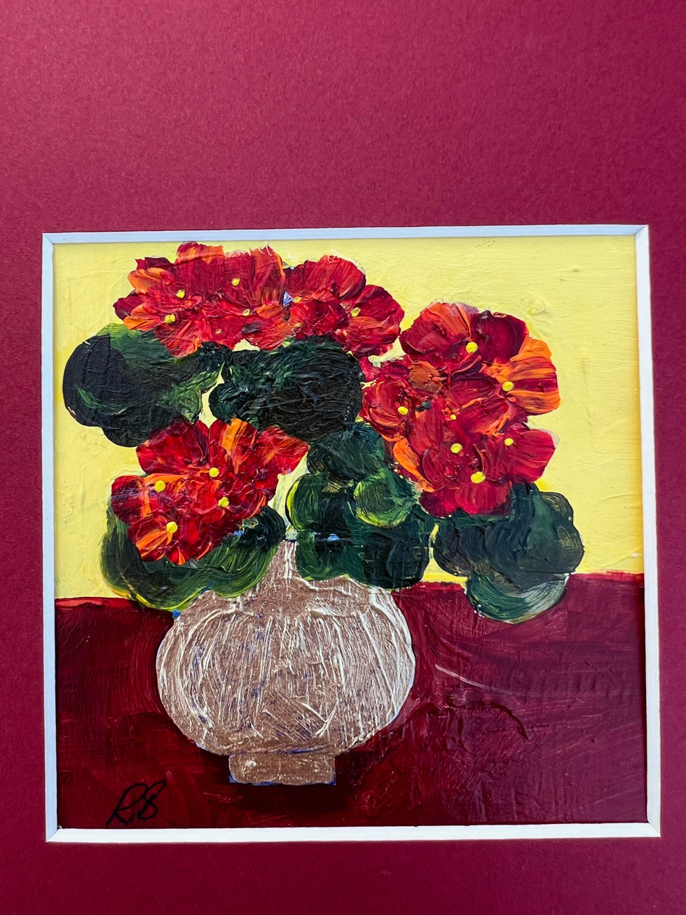 Painted on maroon card and complemented by a beaujolais mount, this piece offers an elegant presentation that combines craftsmanship with timeless appeal. The painting measures 4"x4", presented within a mount measuring 8"x8". All artwork comes with a signed certificate of authenticity.